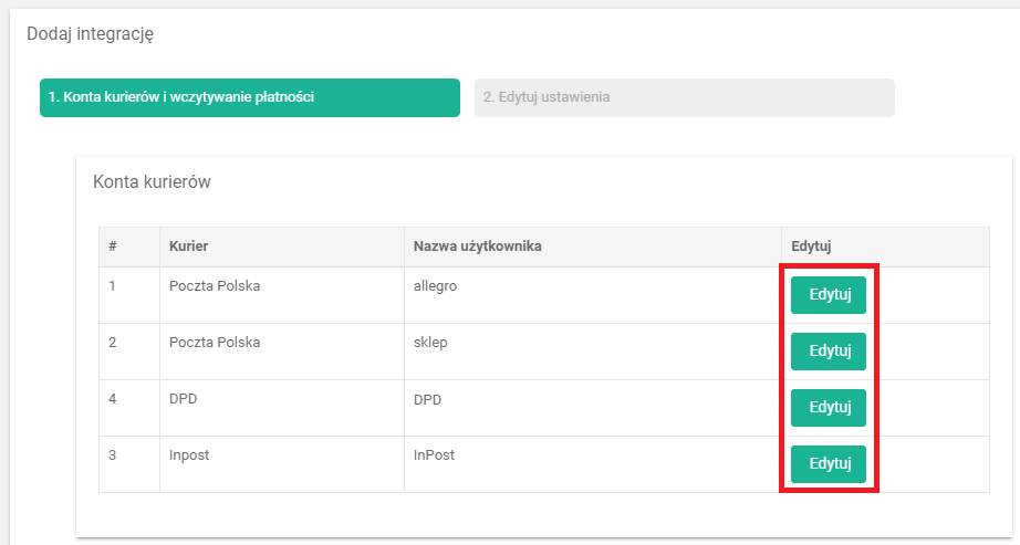 • Otworzy się instalator w którym będą widoczne dodane wcześniej konta kurierów, które można edytować.