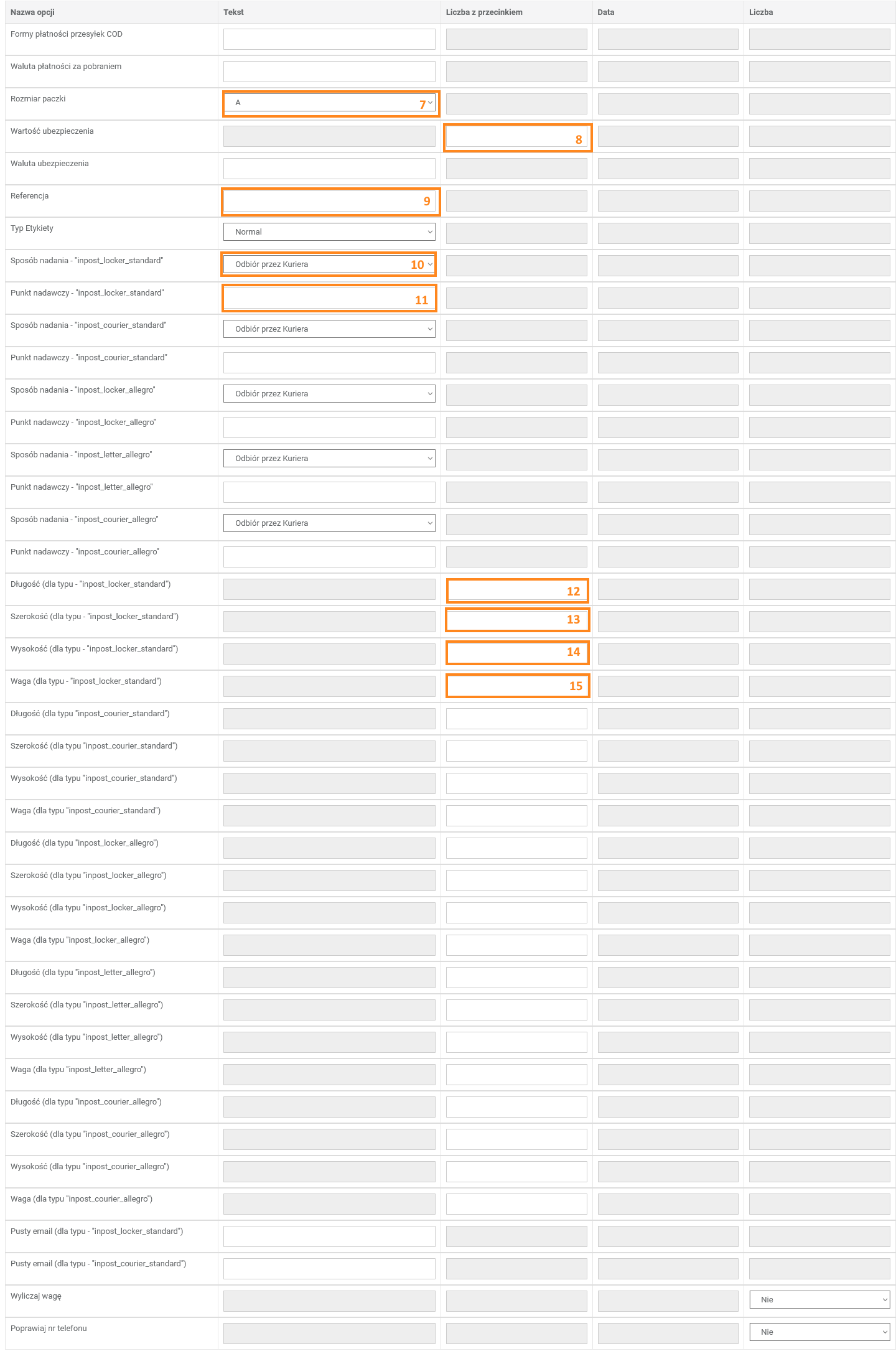| ShipmentTask > Edycja InPost | Waga (dla typu – „inpost_locker_standard”) | 15 | Gabaryt | 2 | Możliwe ustawienie wartości dla paczki niestandardowej | |