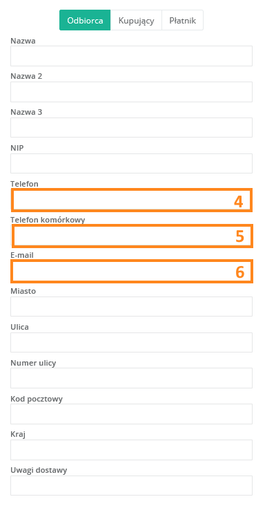 | Formularz zamówienia > Formularz adresu > Odbiorca | Telefon komórkowy | 5 | Odbiorca | Telefon kontaktowy | 6 | Gdy po stronie, w danych Odbiorcy uzupełniony jest Telefon i Telefon komórkowy to pobierany jest numer z pola Telefon. |