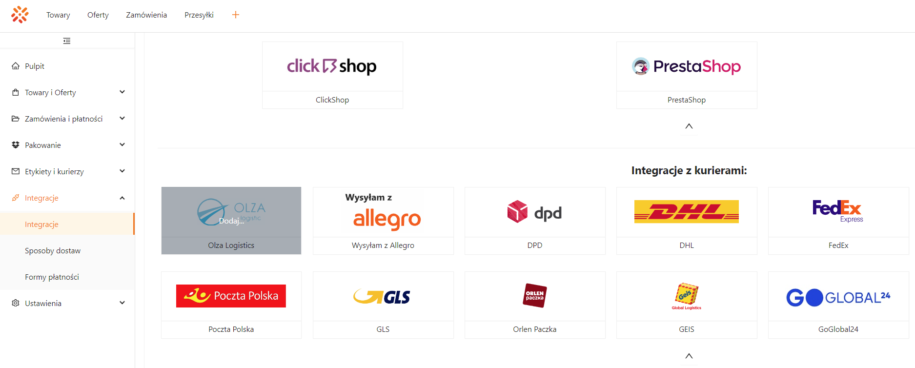 - W sekcji Integracje z kurierami odszukaj i kliknij kafelek z logo Olza Logistic.
