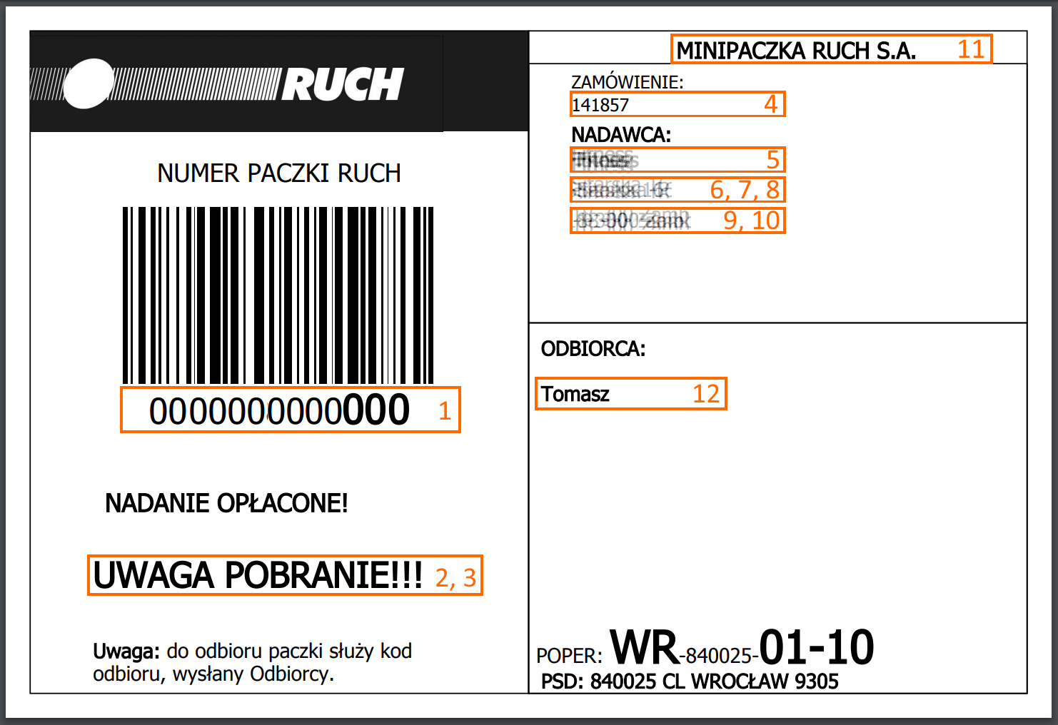 | Formularz zamówienia > Formularz zamówienia | List przewozowy | 1 | Etykieta | Numer Paczki Ruch | 1 | |