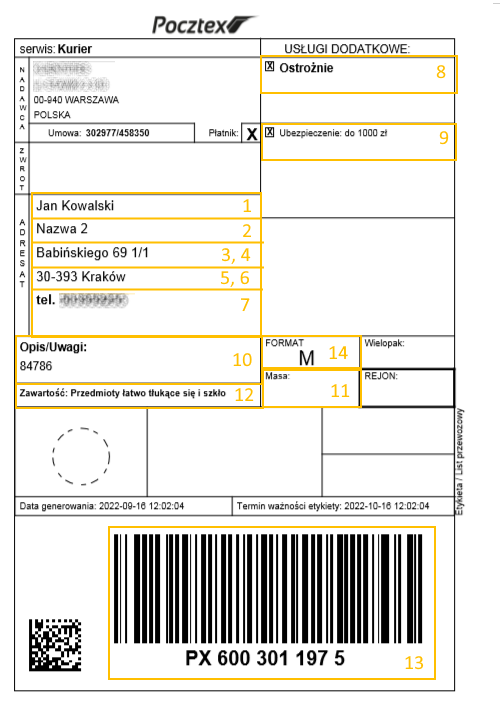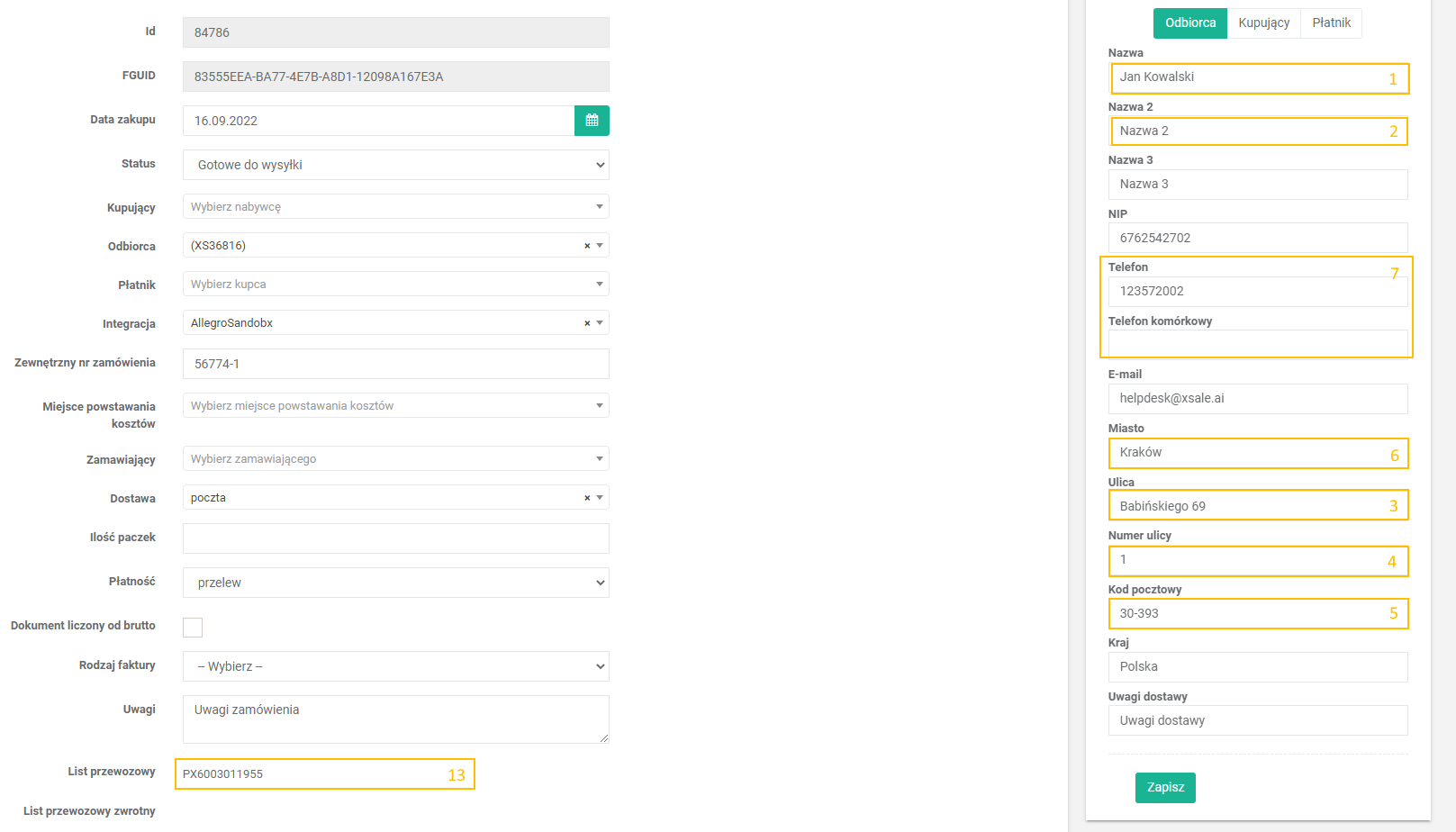 Formularz zamówienia > Formularz adresu > Odbiorca Telefon / Telefon komórkowy 7 Adresat Telefon 7 Jeśli „Telefon komórkowy” nie jest uzupełniony to brany jest „Telefon”.