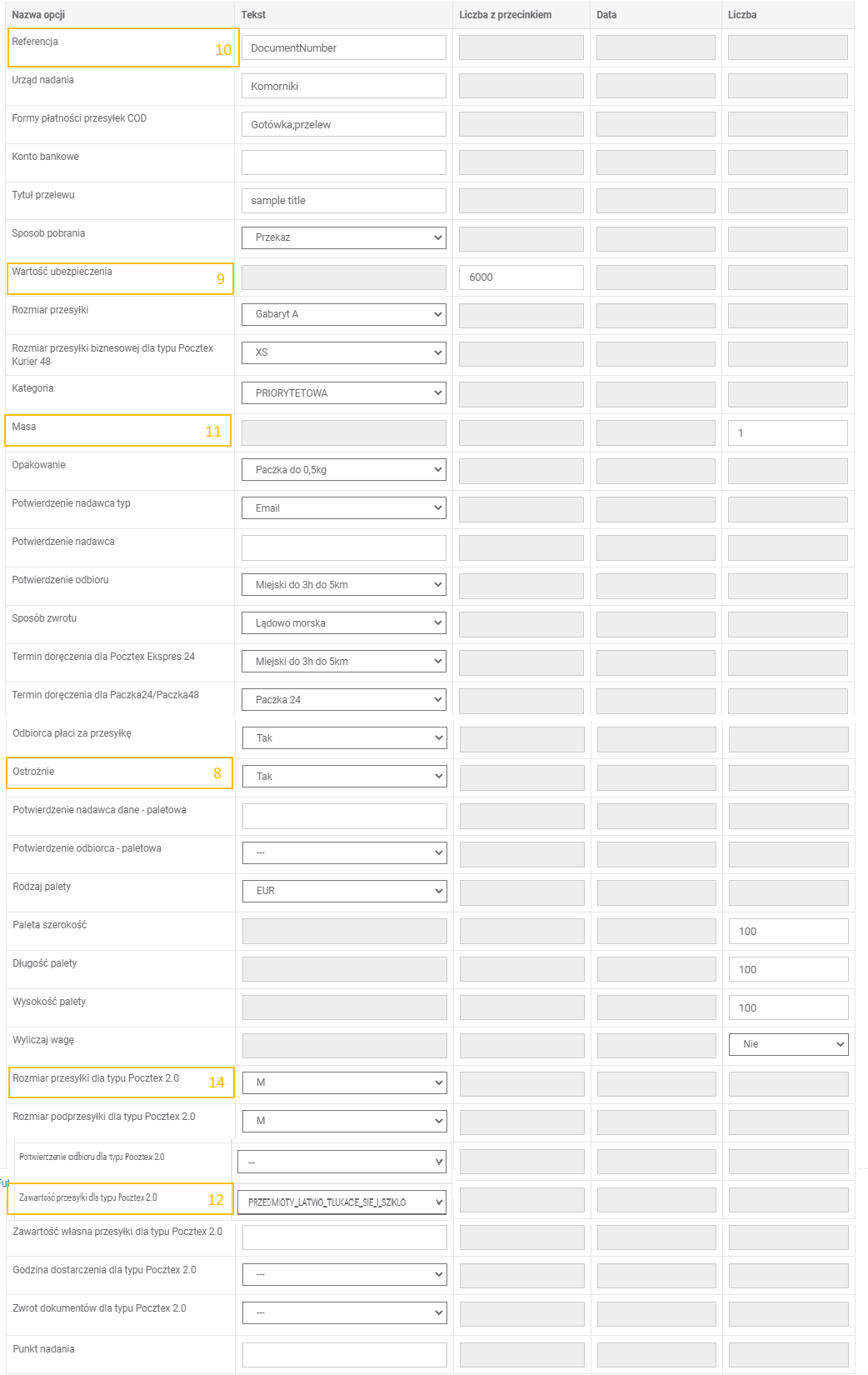 ShipmentTask > Poczty Polskiej Ostrożnie 8 Usługi dodatkowe Ostrożnie 8 Możliwość zaznaczenia innych usług dodatkowych przewidzianych dla danego sposobu dostawy.