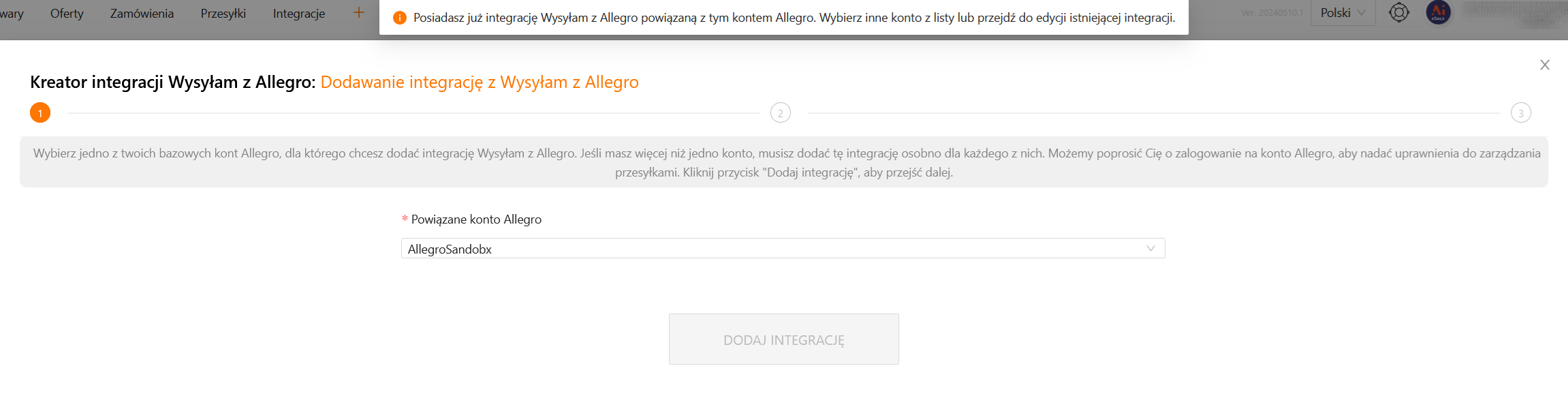 Jeśli konto Allegro ma już powiązaną integrację Wysyłam z Allegro, zobaczysz komunikat jak poniżej: