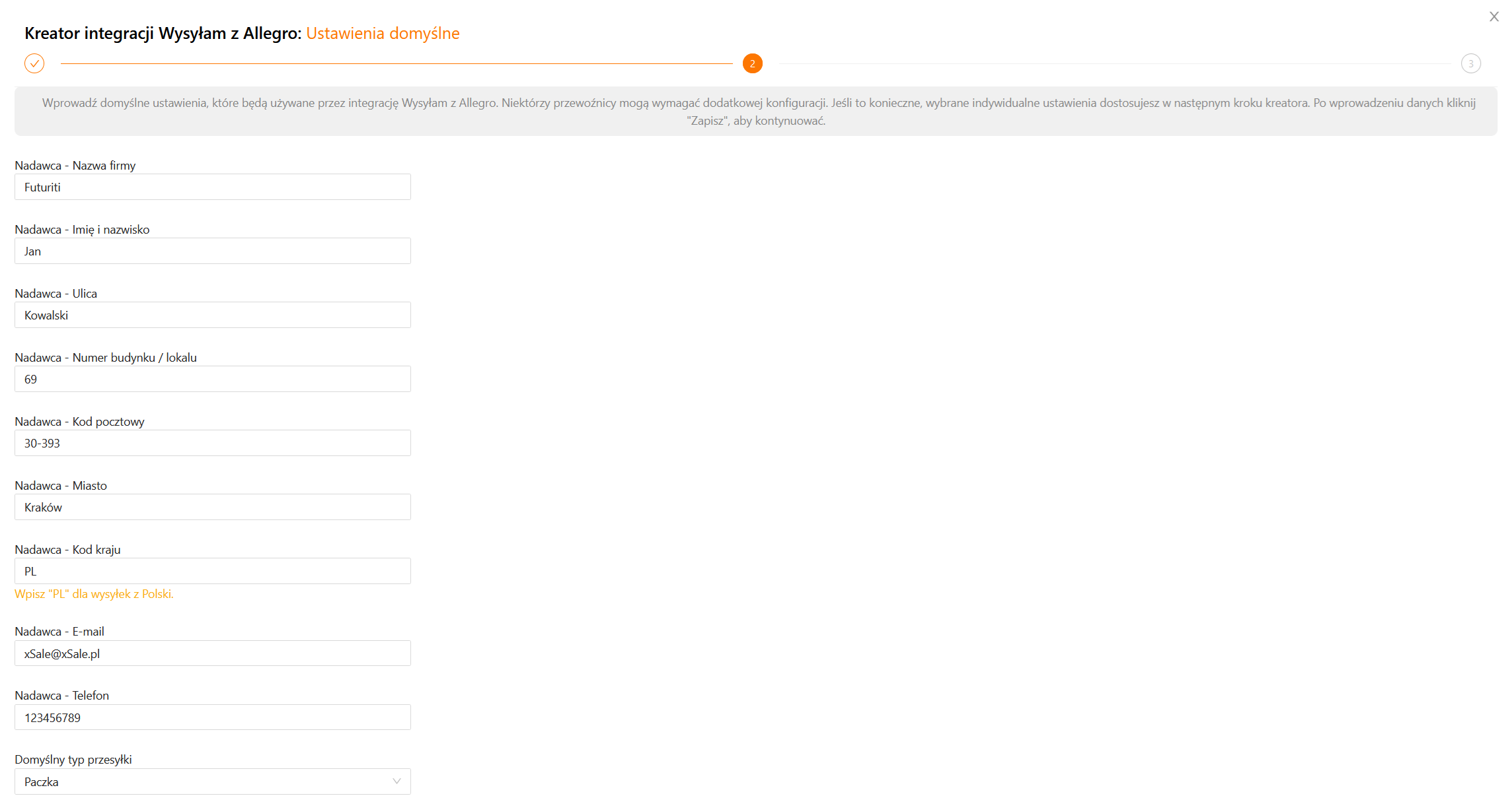 Nadawca – Nazwa firmy – systemy niektórych kurierów posiadają limit znaków w nazwie firmy, np. przekroczenie limitu 30 znaków w tym może powodować błędy w trakcie tworzenia przesyłek.