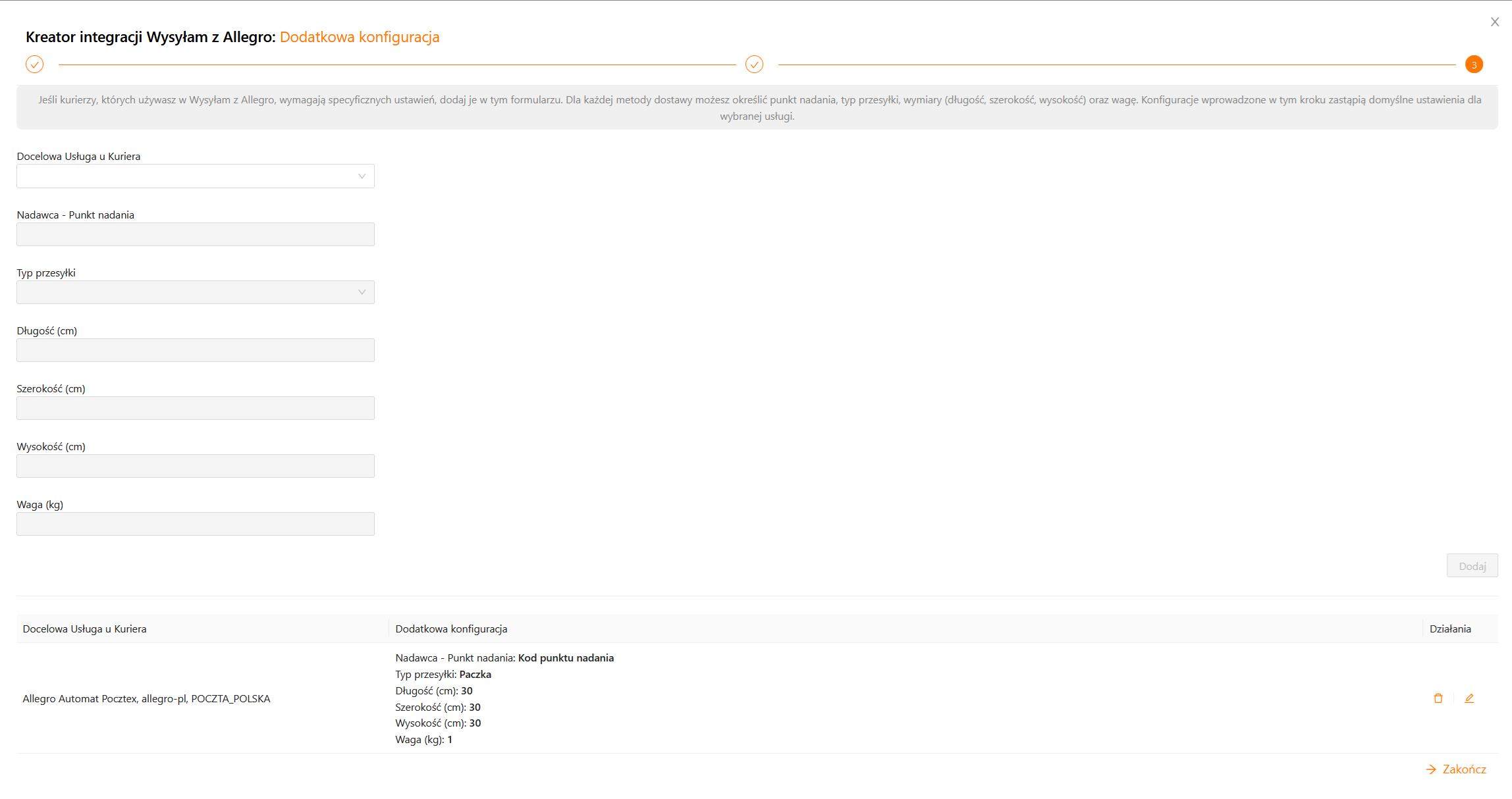Jeśli kurierzy, których używasz w Wysyłam z Allegro, wymagają specyficznych ustawień, dodaj je w tym formularzu. Dla każdej metody dostawy możesz określić punkt nadania, typ przesyłki, wymiary (długość, szerokość, wysokość) oraz wagę. Konfiguracje wprowadzone w tym kroku zastąpią domyślne ustawienia dla wybranej usługi.