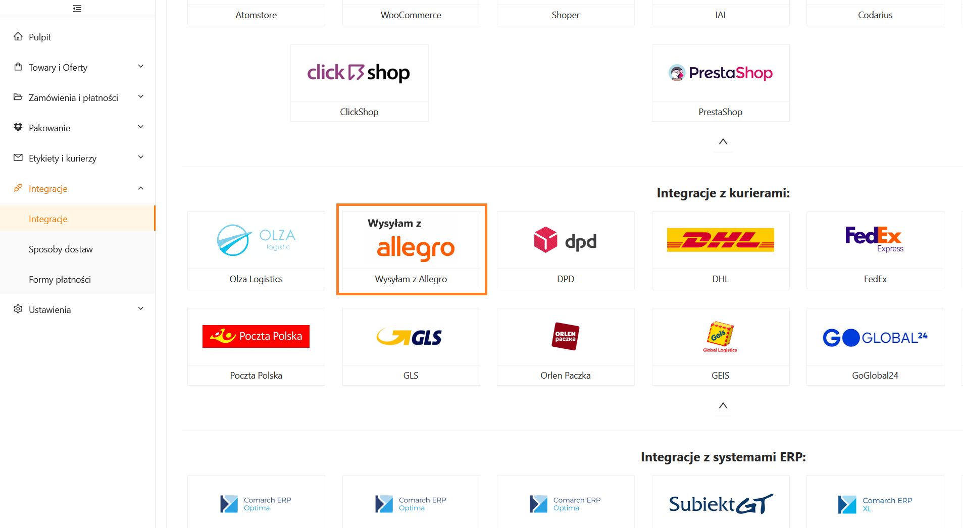 Przejdź do zakładki Integracje. W sekcji Integracje z kurierami wybierz Wysyłam z Allegro: