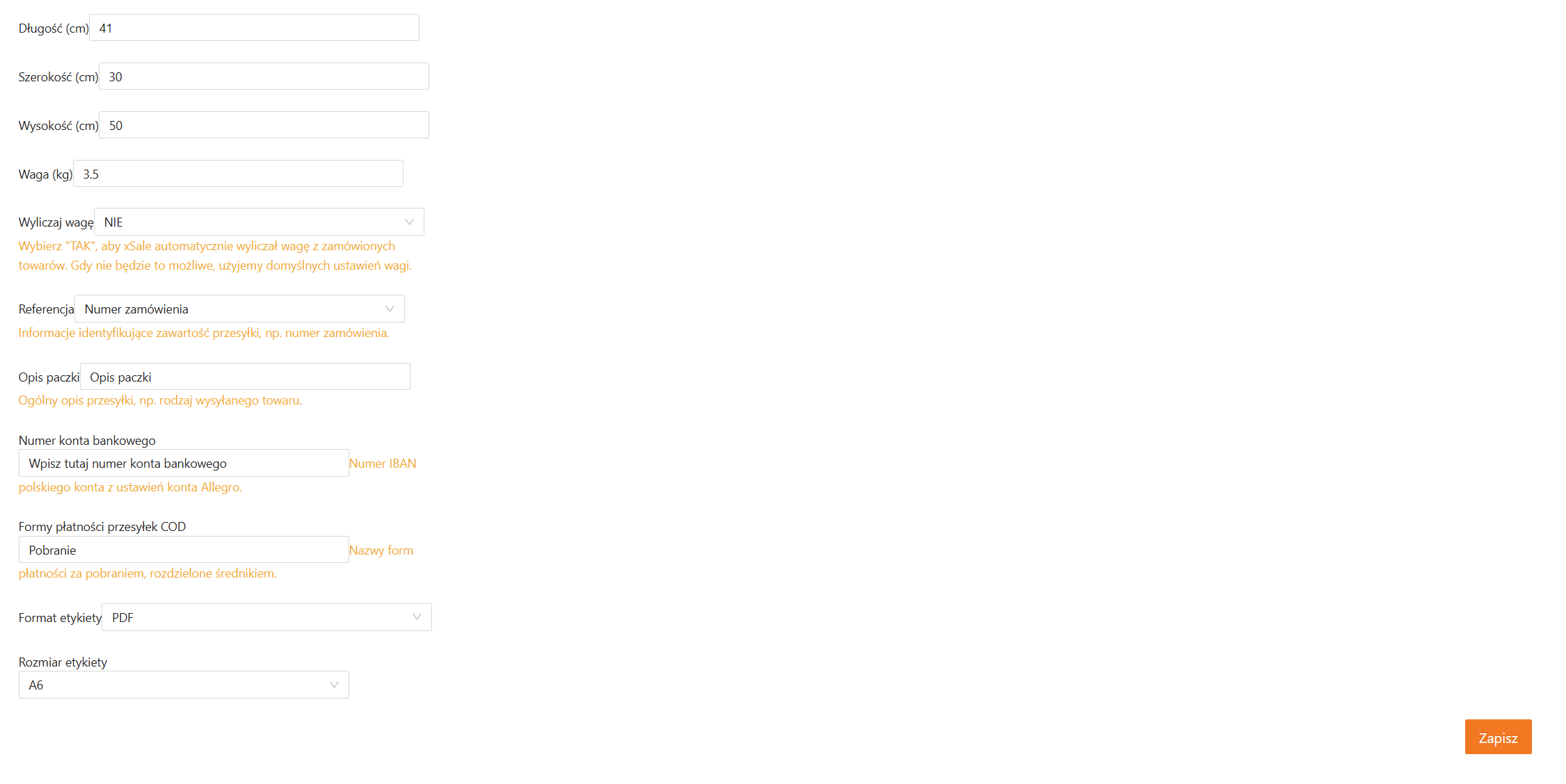 Formy płatności przesyłek COD – w tym polu wprowadź dokładną nazwę formy płatności (taką samą, jak w mapowaniach form płatności). Może to być np. „Pobranie”. Jeśli korzystasz z kilku form płatności za pobraniem, rozdziel je średnikiem, np. „Pobranie;Za pobraniem”.
