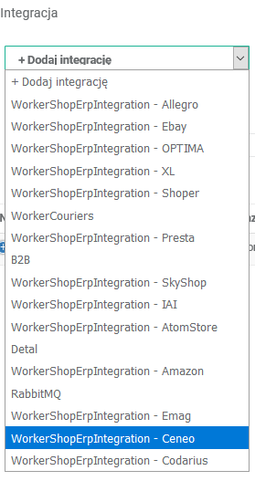 Na liście integracji kliknij przycisk +Dodaj integrację i z listy wybierz integrację z Ceneo.