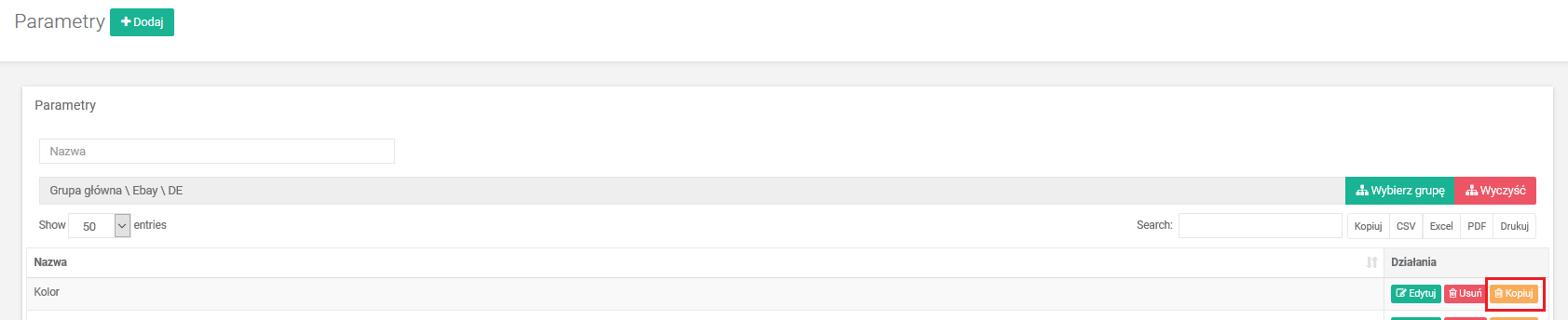 • Następnie przechodzimy do parametrów (Konfiguracja –> Parametry). W kategorii eBay w której będzie wystawiona oferta odnajdujemy parametr, który chcemy zastosować jako wielowartościowy np. Kolor i klikamy przy nim Kopiuj.
