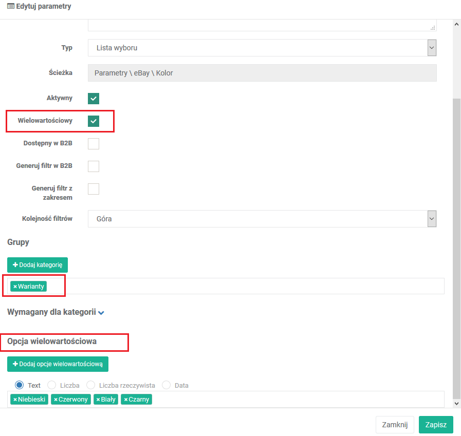 • W polu Opcja wielowartościowa można podać własne wartości jakie przyjmuje ten parametr, czyli można podać kolory np. czerwony, niebieski, czarny.