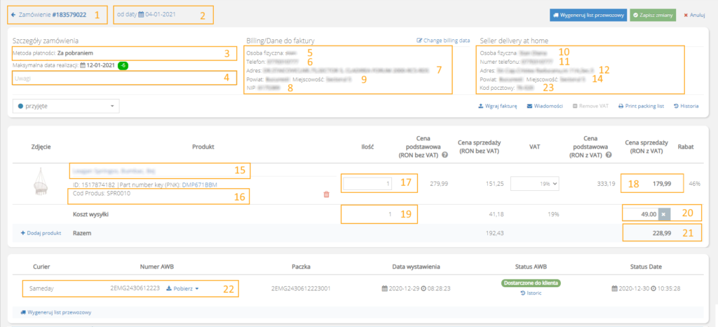 | Edycja zamówienia > Formularz adresu > Odbiorca | Telefon | 11 | Seller delivery at home | Numer telefonu | 11 | |