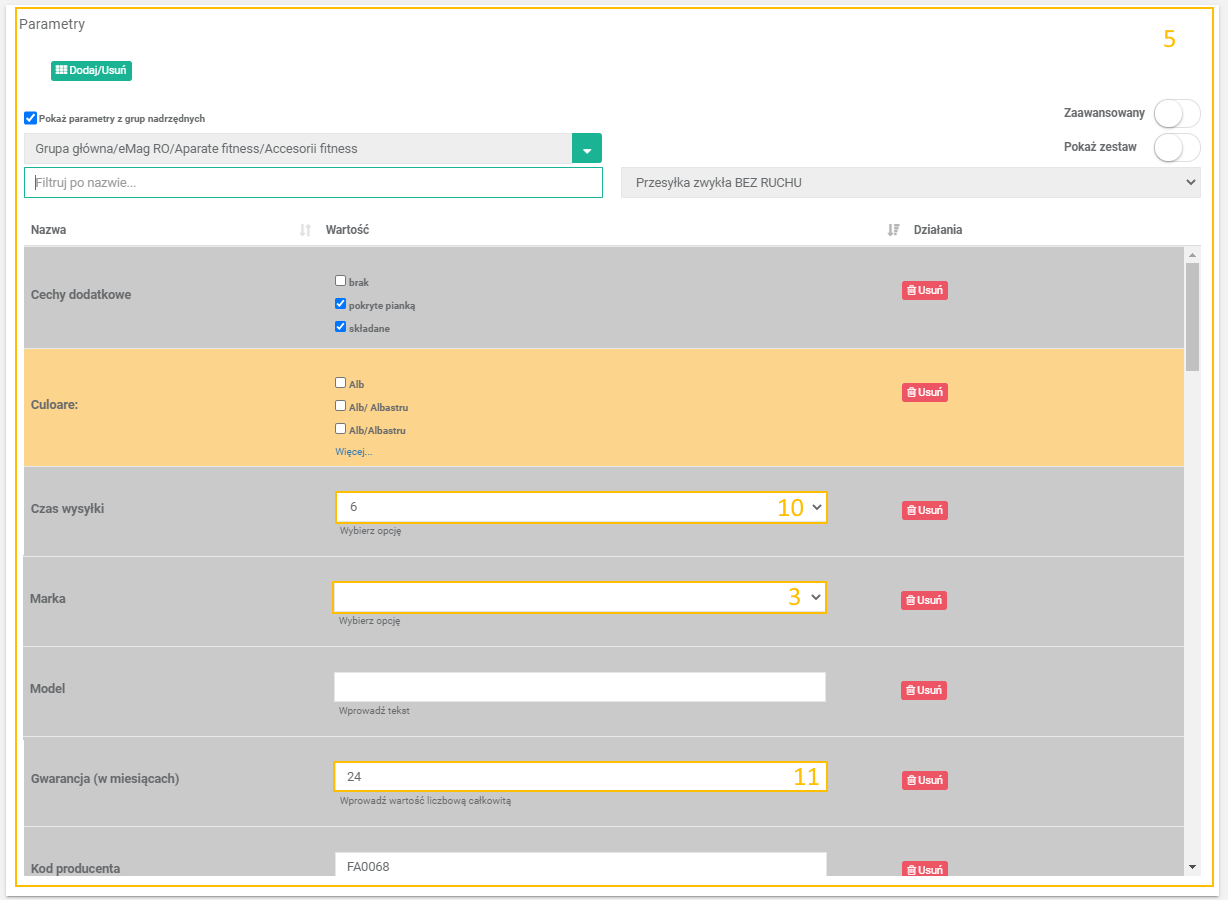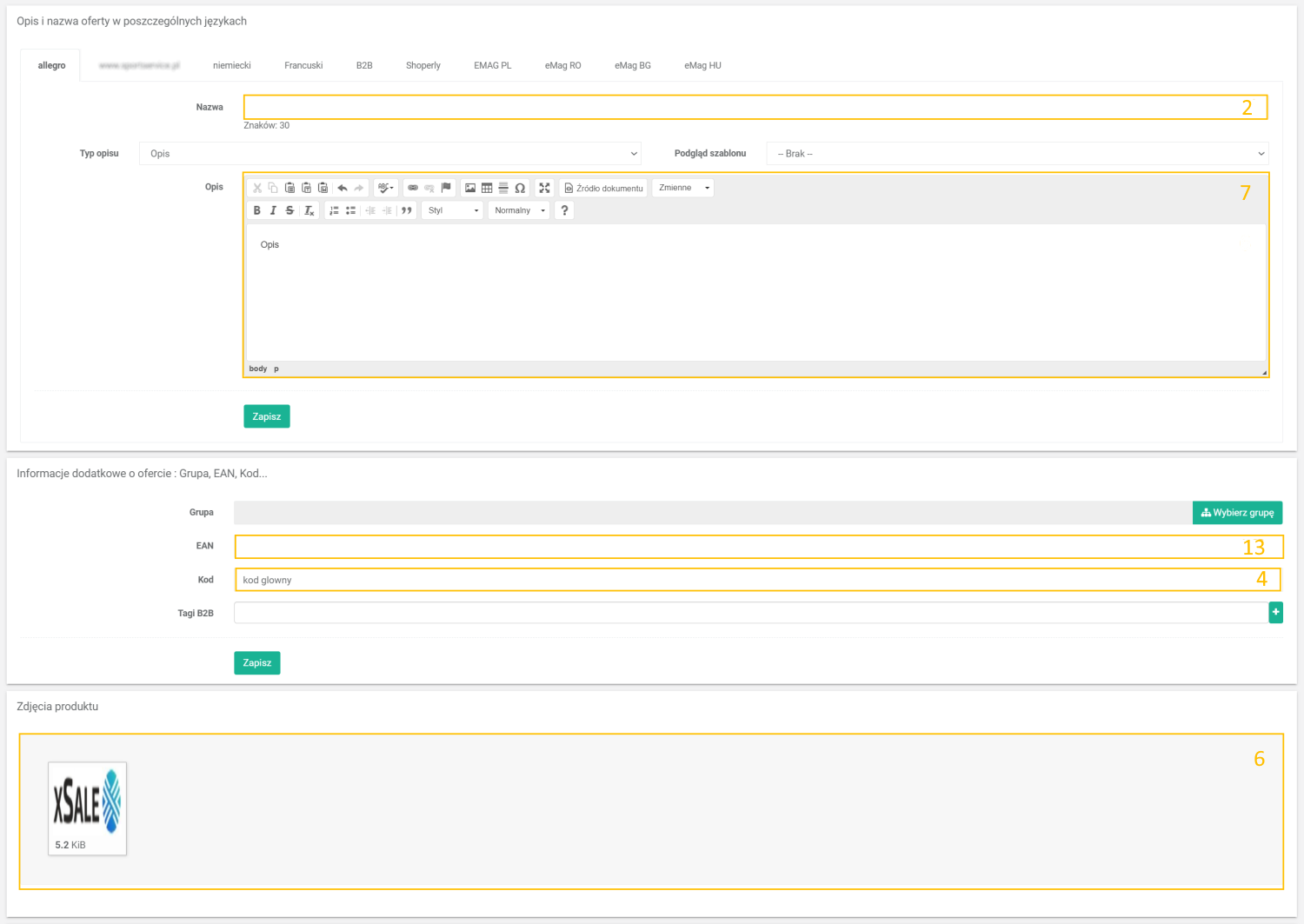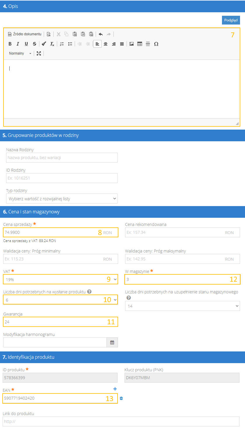 | Opis i nazwa oferty w poszczególnych językach | Opis | 7 | 4. Opis | Opis | 7 | Tylko dla nowo zakładanych ofert. Treści oferty nie można edytować gdy produkt już istnieje w eMag. |
