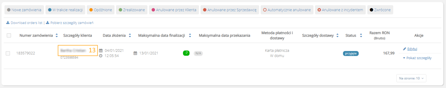 | Edycja zamówienia > Formularz adresu > Odbiorca | Nazwa | 10 | Seller delivery at home | Osoba fizyczna | 10 | |