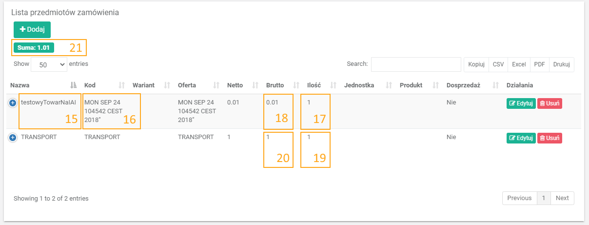 | Edycja zamówienia > Lista przedmiotów zamówienia | Suma | 21 | Szczegóły zamówienia | Razem | 21 | |