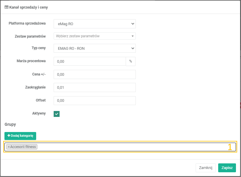 | Kanały sprzedaży i ceny > Grupy | Grupy | 1 | 1. Szczegóły kategorii i produktu | Kategoria | 1 | Można przekazywać tylko jedną grupę. |