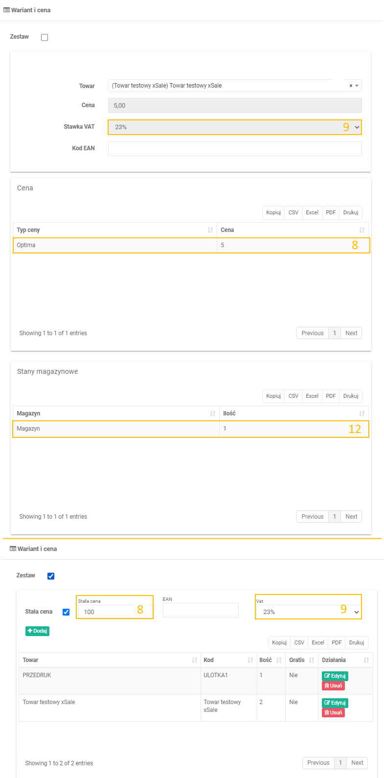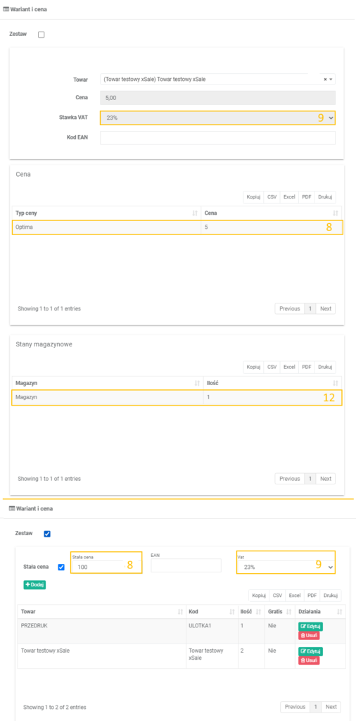 | Warianty i cena > VAT; Warianty i cena > Zestaw > VAT | Stawka VAT | 9 | 6. Cena i stan magazynowy | VAT | 9 | |
