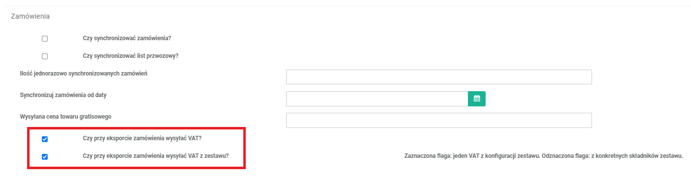 - Zaznaczona flaga oznacza wysyłanie jednej stawki VAT z konfiguracji zestawu.