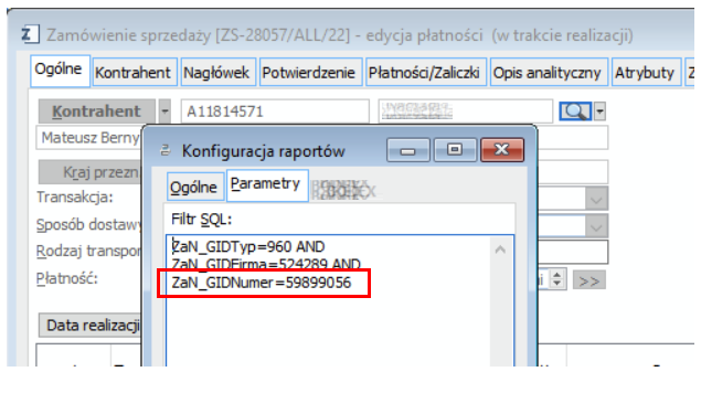 Na zamówieniu (ZS), podany GIDNumer można uzyskać mając otwarty formularz zamówienia i trzymając Ctrl przyciskając ikonę wykrzyknika z ikon na wstążce (Wykonanie raportu)