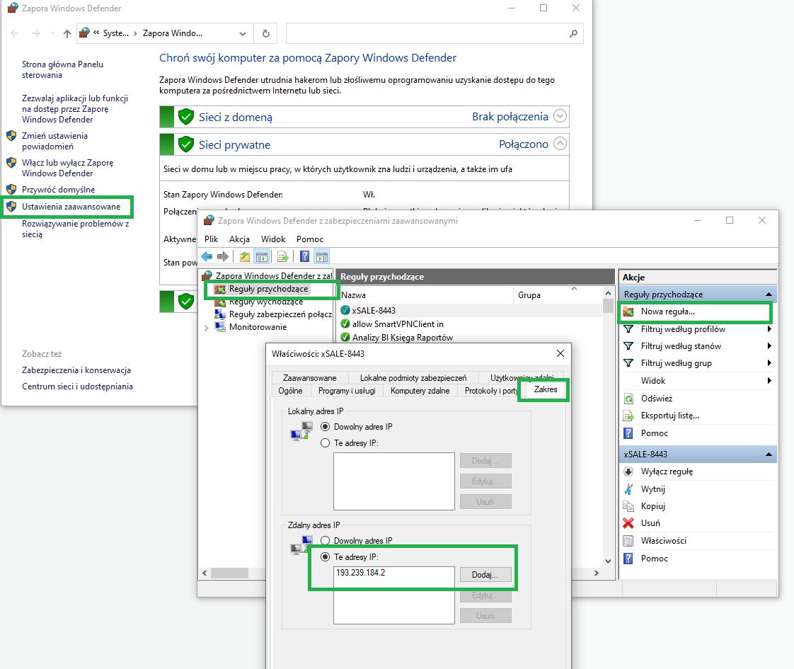1. Start Windows /-> wpisujemy „zapora windows” /-> Ustawienia zaawansowane / -> Reguły przychodzące /-> Nowa reguła