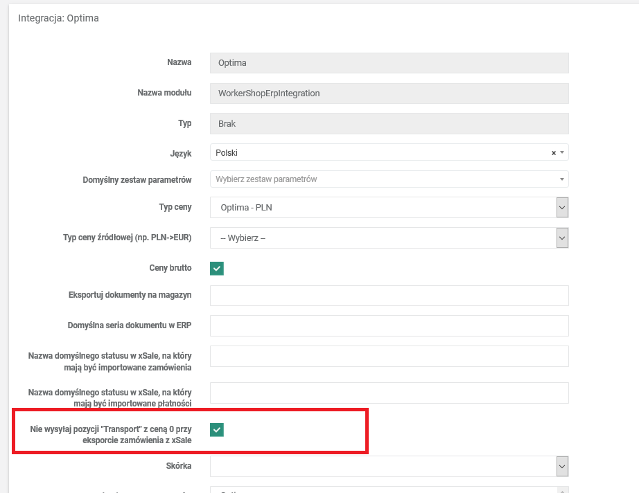 Jeżeli chcesz zaznaczyć tą opcję wejdź w menu Konfiguracja –> Ogólne –> Integracje i edytuj integrację z systemem ERP. Następnie na stronie edycji integracji zaznacz opcję Nie wysyłaj pozycji „Transport” z ceną 0 przy eksporcie zamówienia z xSale.