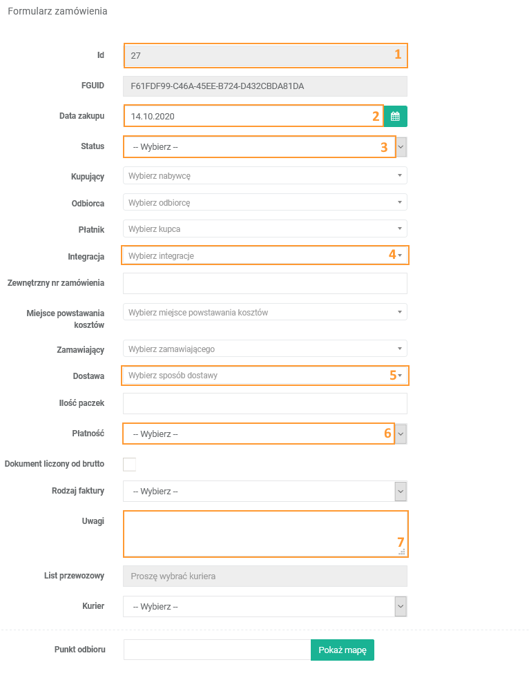 | Edycja zamówienia > Formularz zamówienia | Data zakupu | 2 | Lista zamówień > Operacje > Stwórz przesyłkę > Pozostałe informacje | Data | 2 |