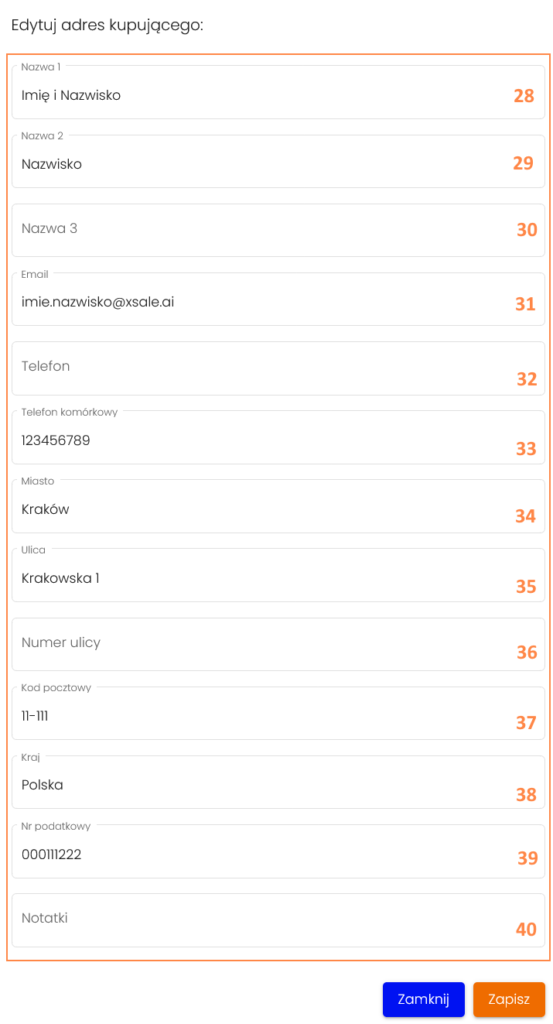 | Edycja zamówienia > Formularz adresu > Kupujący | NIP | 31 | Lista zamówień > Operacje > Stwórz przesyłkę > Kupujący > Edytuj adres kupującego | Nr podatkowy | 39 |