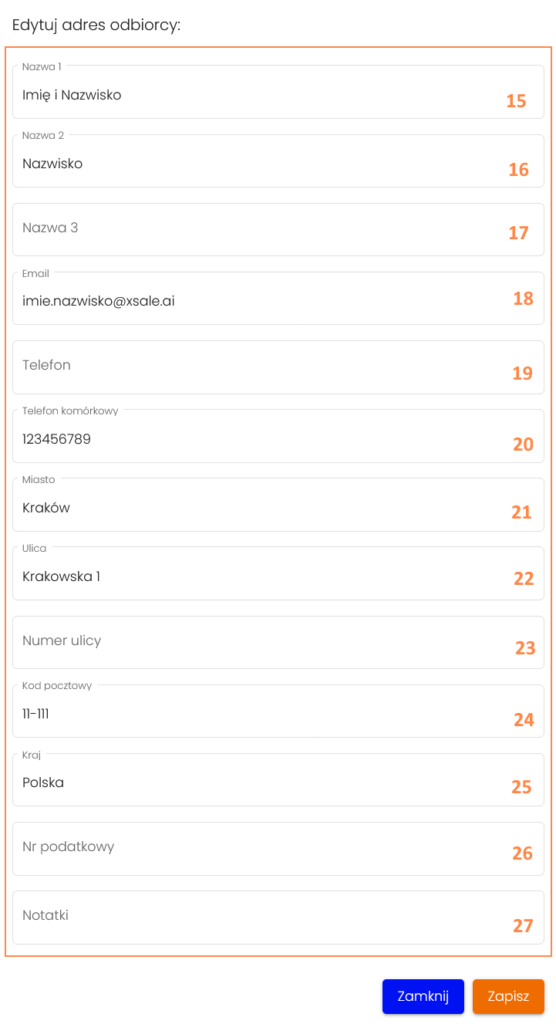 | Edycja zamówienia > Formularz adresu > Odbiorca | 21 | Lista zamówień > Operacje > Stwórz przesyłkę > Odbiorca > Edytuj adres odbiorcy | 18 | ||