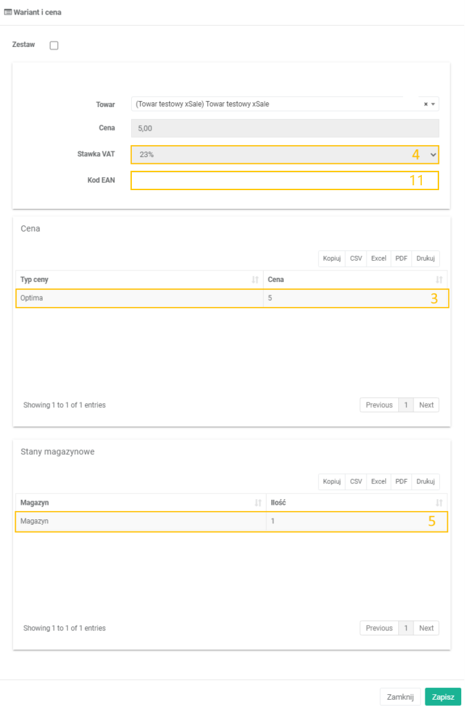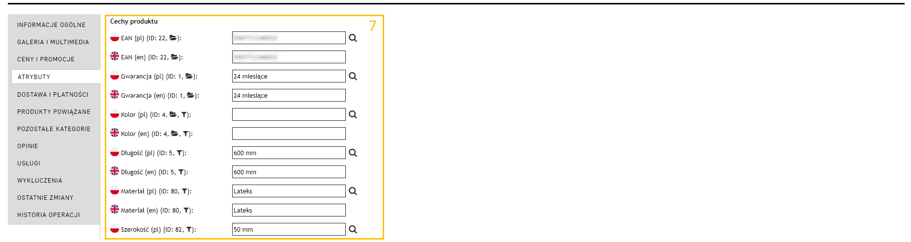 | Warianty i cena > Kod EAN | Kod | 11 | Atrybuty | Cechy produktu | 7 | Kod przekazywany jest do pola EAN |