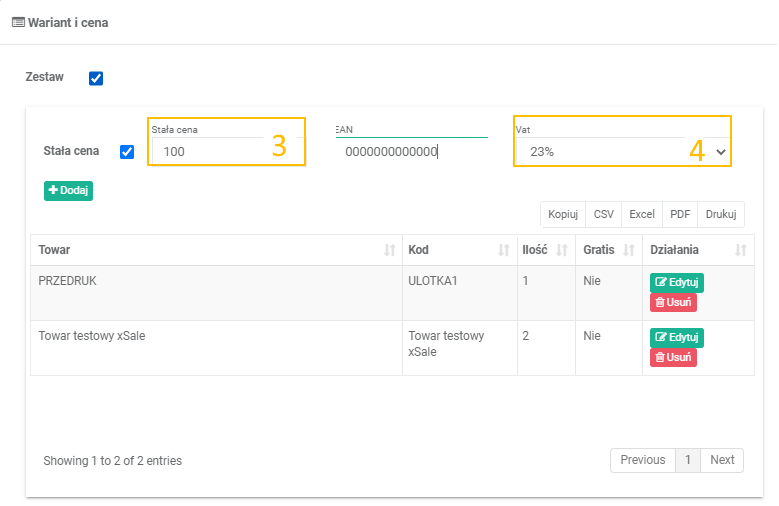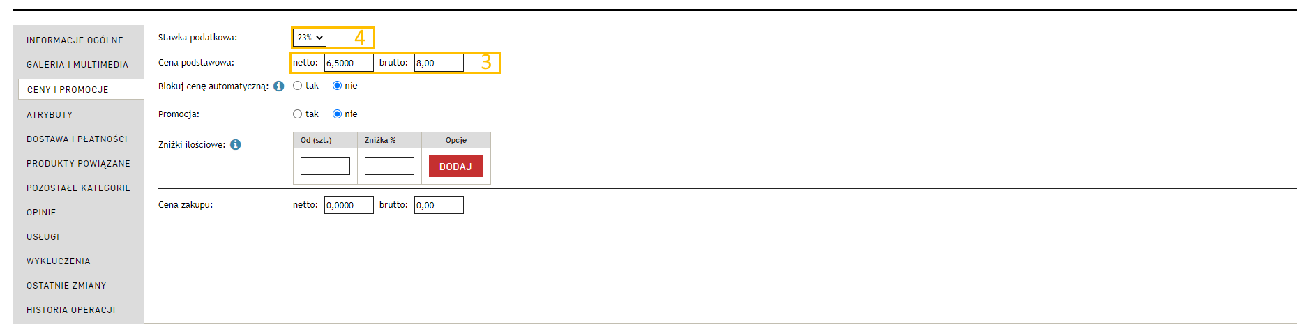 | Warianty i cena > VAT; Warianty i cena > Zestaw > VAT | Stawka VAT | 4 | Informacje ogólne, Ceny i promocje | Stawka podstawowa | 4 | |