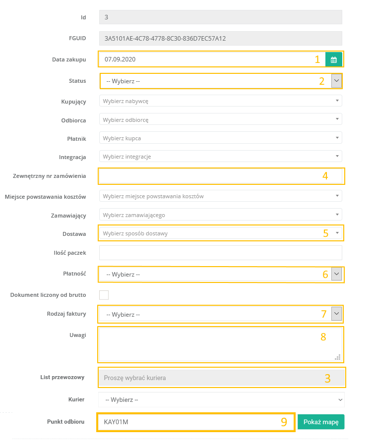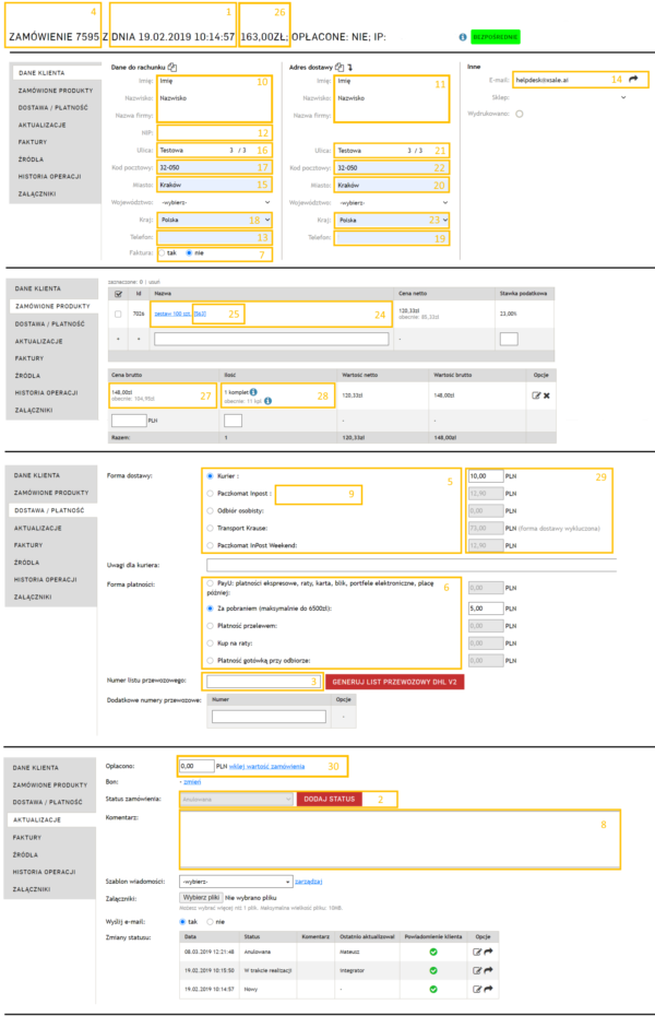 | Edycja zamówienia > Formularz zamówienia | List przewozowy | 3 | Edycja Zamówienia > Dostawa płatność > Numer listu przewozowego | Numer listu przewozowego | 3 | |