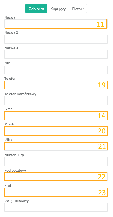 | Edycja zamówienia > Formularz adresu > Odbiorca | Telefon | 19 | Edycja Zamówienia > Dane klienta > Adres dostawy | Telefon | 19 | |
