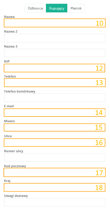| Edycja zamówienia > Formularz adresu > Kupujący | Telefon | 13 | Edycja Zamówienia > Dane klienta > Dane do rachunku | Telefon | 13 | |