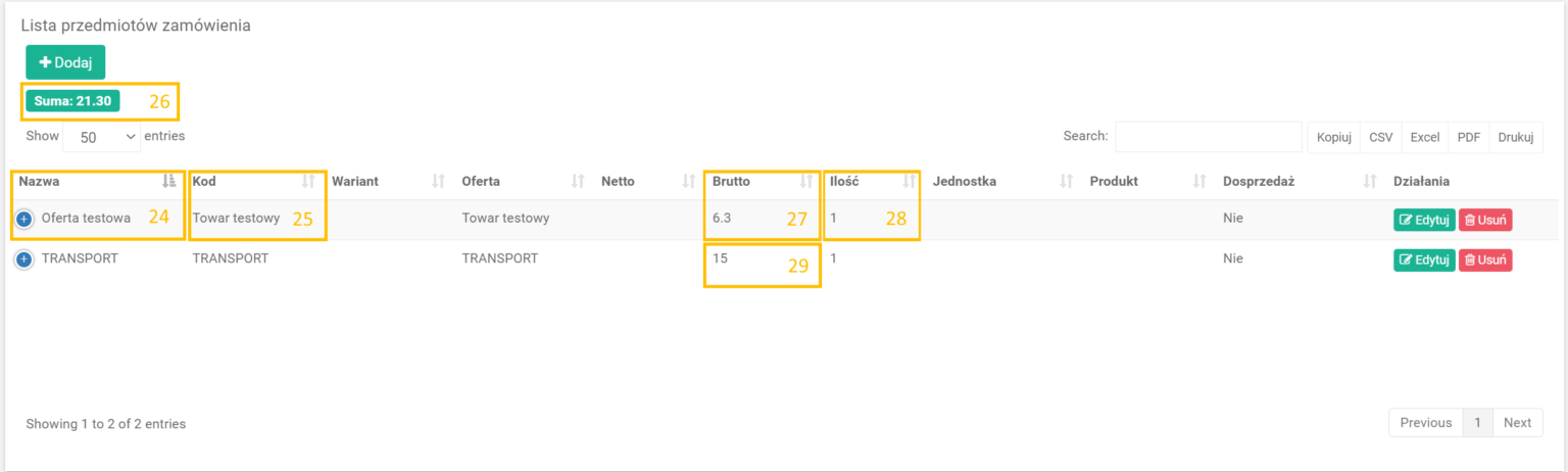 | Edycja zamówienia > Lista przedmiotów zamówienia | Transport brutto | 29 | Edycja Zamówienia > Dostawa płatność > Forma dostawy | Forma dostawy | 29 | |