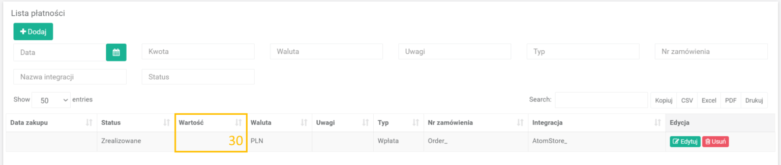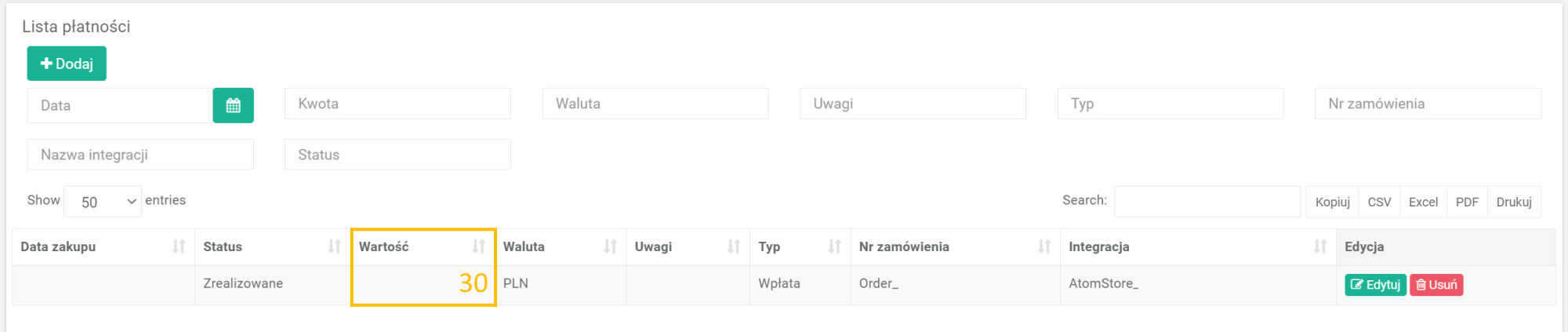 | Edycja zamówienia > Lista płatności | Wartość | 30 | Edycja Zamówienia > Aktualizacje > Opłacono | Opłacono | 30 | Jeśli zamówienie jest opłacone |