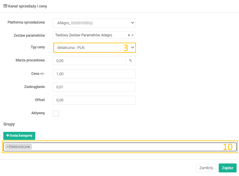 | Kanały sprzedaży i ceny > Grupy | Grupy | 10 | Informacje ogólne | Kategoria | 10 | Można przekazywać tylko jedną grupę. |