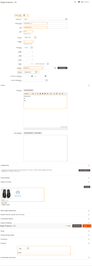 Poza standardowymi ofertami jednowariantowymi xSale może też tworzyć w Magento oferty wielowariantowe (np. buty w różnych rozmiarach). Oferta wielowariantowa w xSale ma utworzyć w Magento „Configurable Product”, który domyślnie będzie widoczny od strony klienta tj.  Visibility = Catalog, Search. Pod „Configurable Product” będą podpięte warianty z xSale czyli „Simple Product” gdzie każdy 1 wariant w xSale to 1 „Simple Product” w Magento, który w przypadku oferty wielowariantowej jest niewidoczny osobno tj Visibility = Not Visible Indivdually.