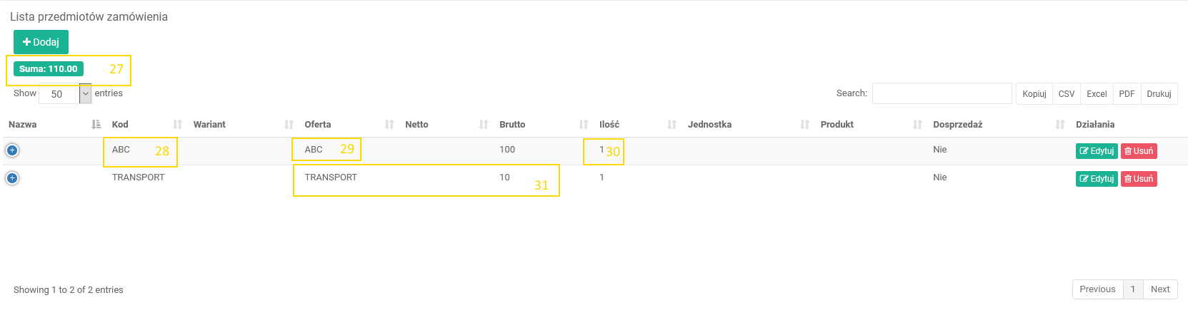 Edycja zamówienia > Lista przedmiotów zamówienia Kod 28 Sales -> Orders -> View->  Items Ordered -> Product  SKU 7 Uwaga: Kod w xSale zależy od kodu towaru podłączonego do oferty i w niektórych przypadkach może być różny od SKU.