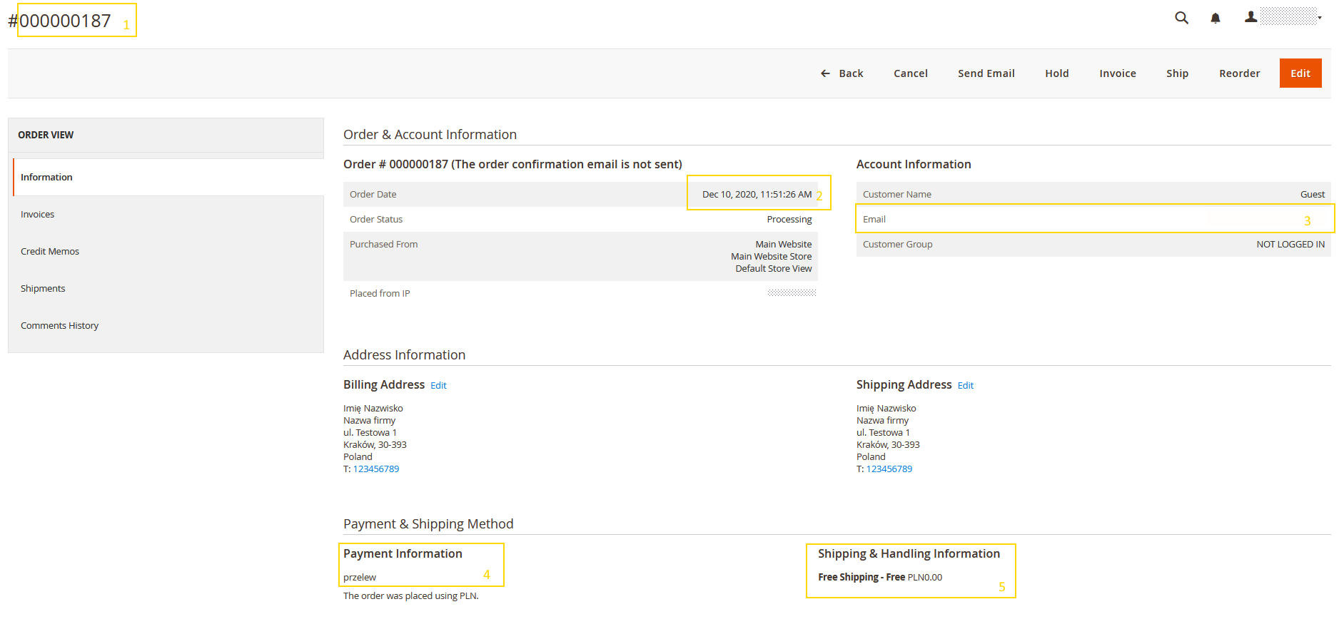 Edycja zamówienia > Formularz zamówienia Płatność 5 Sales -> Orders -> View-> Payment & Shipping Method Payment Information 4 Pole mapowane według mapowania podanego na ustawieniach integracji w xSale