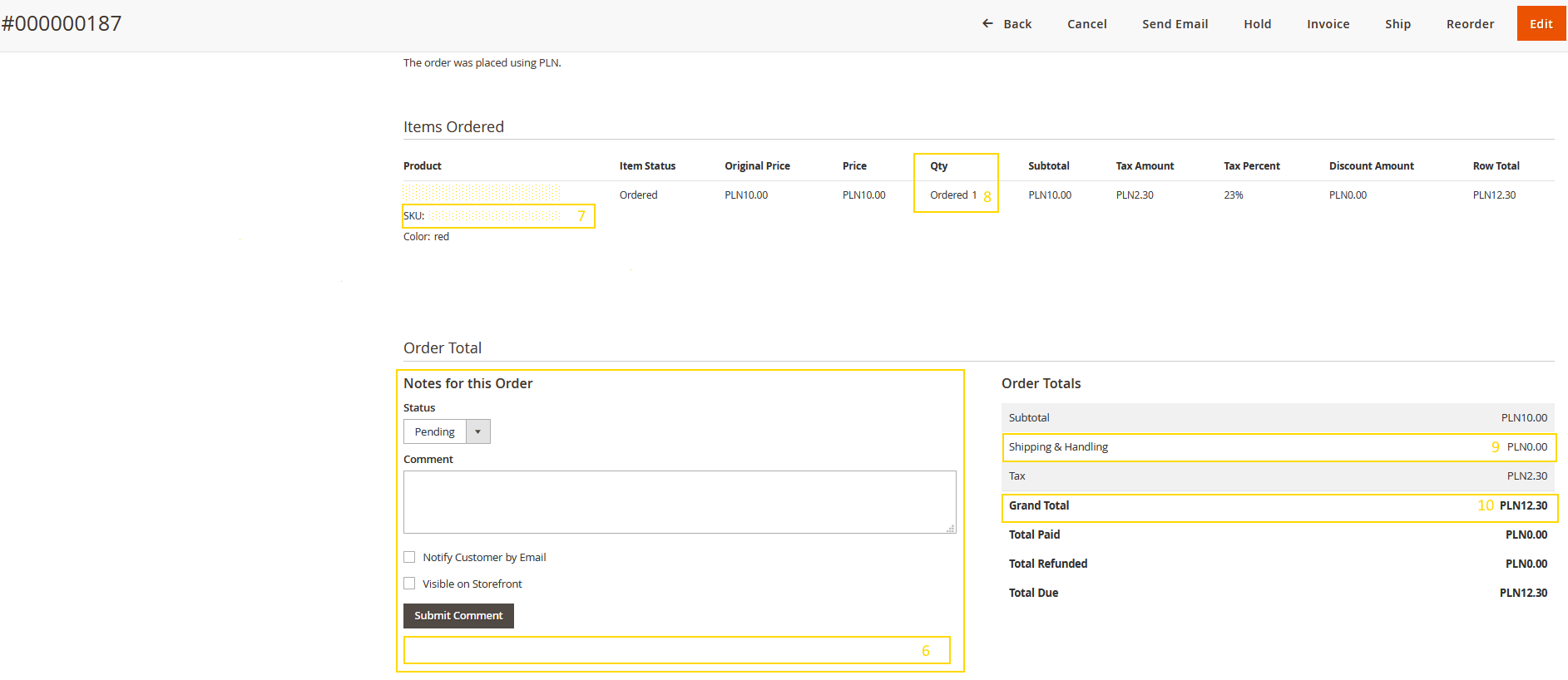 Edycja zamówienia > Formularz zamówienia Dostawa 4 Sales -> Orders -> View-> Payment & Shipping Method Shipping & Handling Information 5 Pole mapowane według mapowania podanego na ustawieniach integracji w xSale