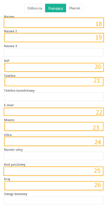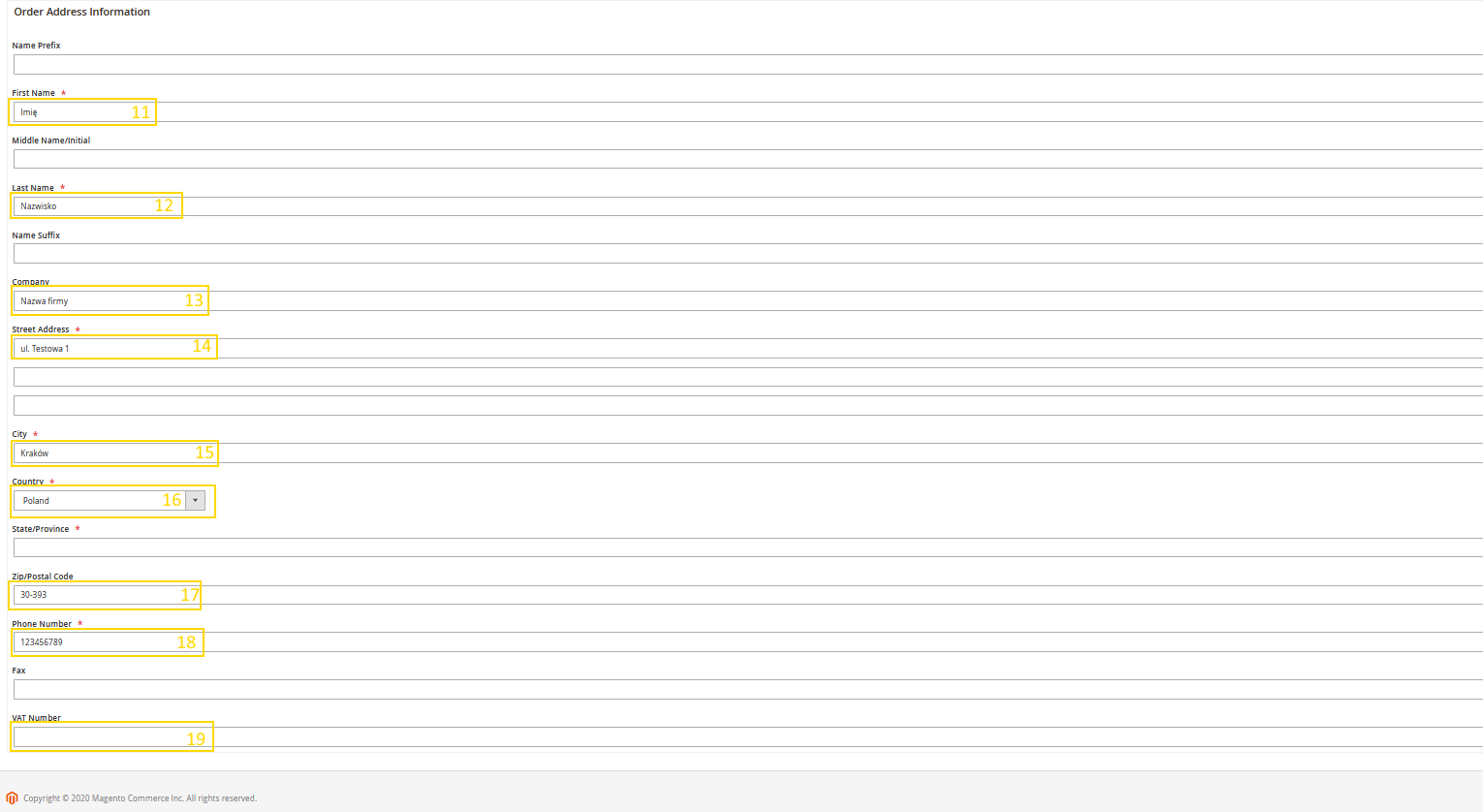 Edycja zamówienia > Formularz adresu > Kupujący Nazwa 2 19 Sales -> Orders -> View-> Addres Information -> Billing Address -> Edit Comapany 13