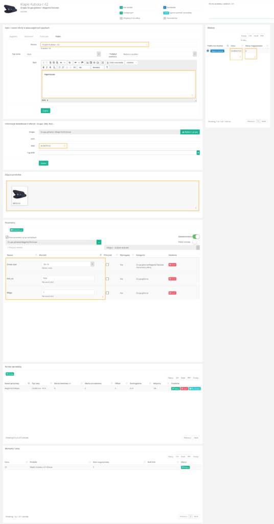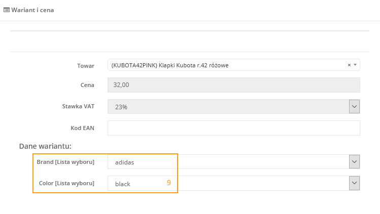 Warianty i ceny > Wariant > Dane wariantu > Wariant  *tylko dla wielowariantowej  9 Attribute  10