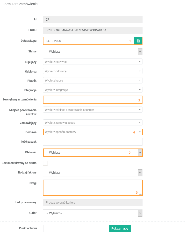 Zamówienie -> Formularz zamówienia -> Punkt odbioru   Wysyłka & Pakowanie   Punkt odbioru InPost. Wartość jest pobierana najpierw z pola inpost_locker_id. Jeśli pole jest puste to w drugiej kolejności z shipping_place_id