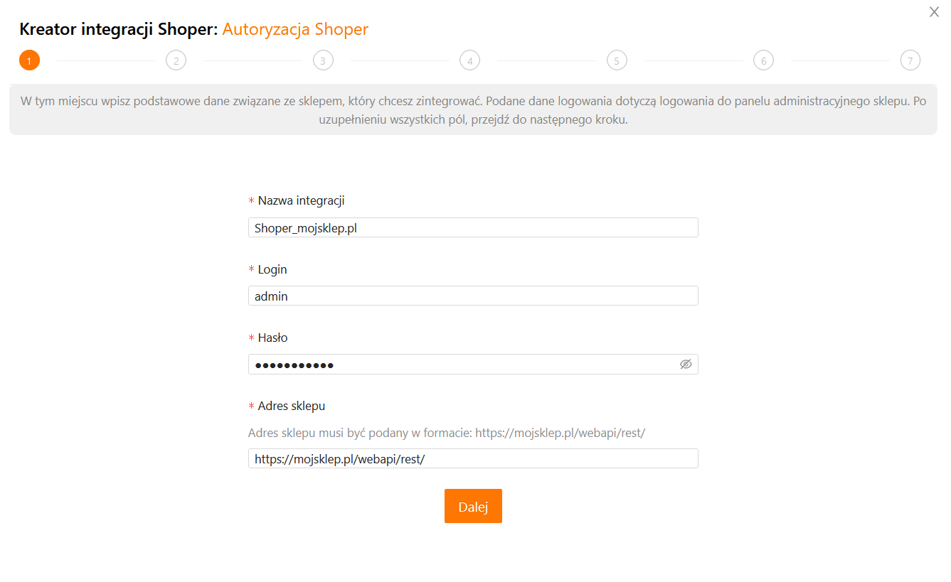 W pierwszym kroku kreatora podajemy nazwę integracji oraz dane do logowanie do panelu sklepu. Wymagane jest aby podany użytkownik panelu Shoper posiadał uprawnienia do webapi sklepu oraz aby adres sklepu był podany z użyciem protokołu HTTPS w formacie np. https://mojsklep.pl/webapi/rest/.