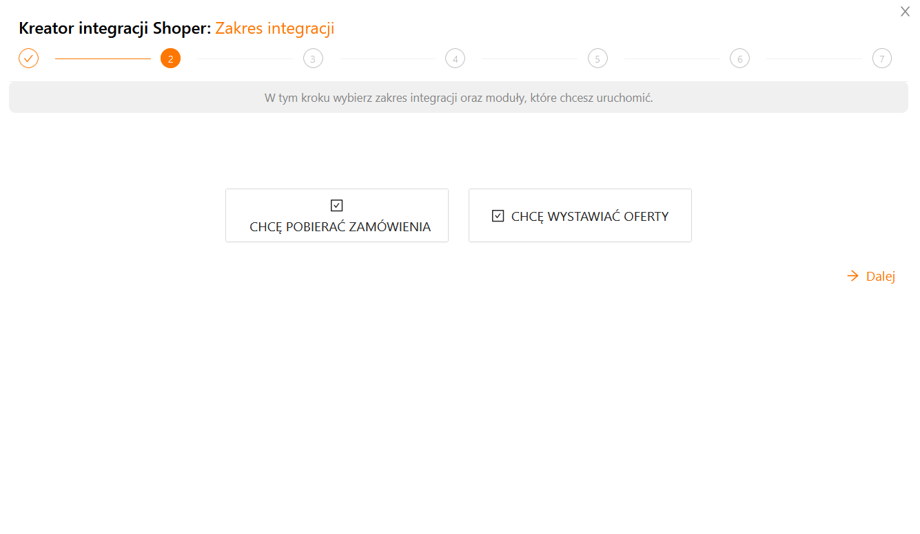 W drugim kroku należy określić zakres integracji, czyli czy chcemy pobierać zamówienia, czy wystawiać oferty. Domyślnie obie opcją są zaznaczone.