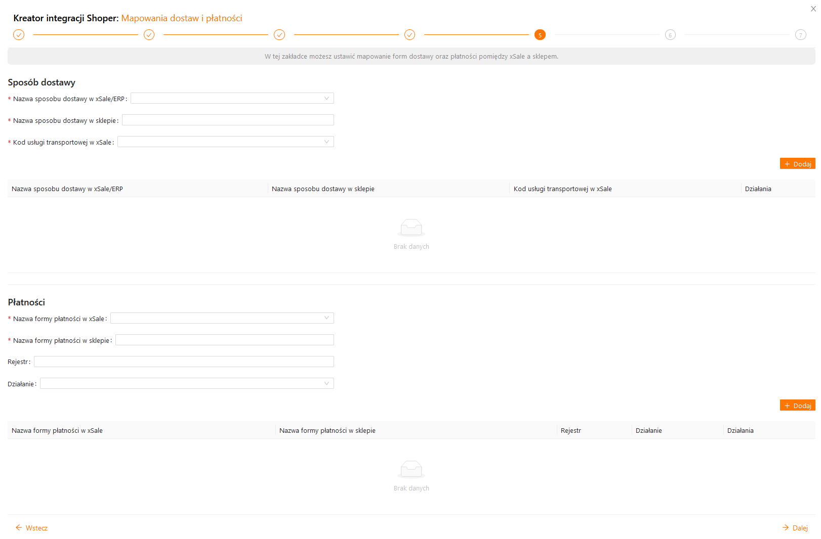 W tym kroku ustalamy na jakie typy płatności wczytywać zamówienia z Shoper oraz w jaki sposób wczytywać formy dostawy.  Konfiguracja mapowań dostaw i płatności została szczegółowo opisana w osobnych artykułach.
