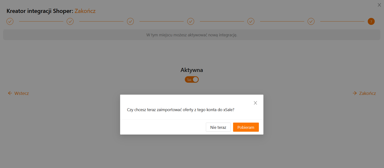 W ostatnim kroku kreatora możemy od razu aktywować i zapisać integrację. Po jej zapisaniu pojawi się okno z pytaniem „Czy chcesz zaimportować oferty z tego konta do xSale?” Kliknięcie opcji Pobieram uruchamia import ofert z Shoper do xSale analogicznie jak przycisk Importuj oferty, który znajduje się na edycji zapisanej już integracji.