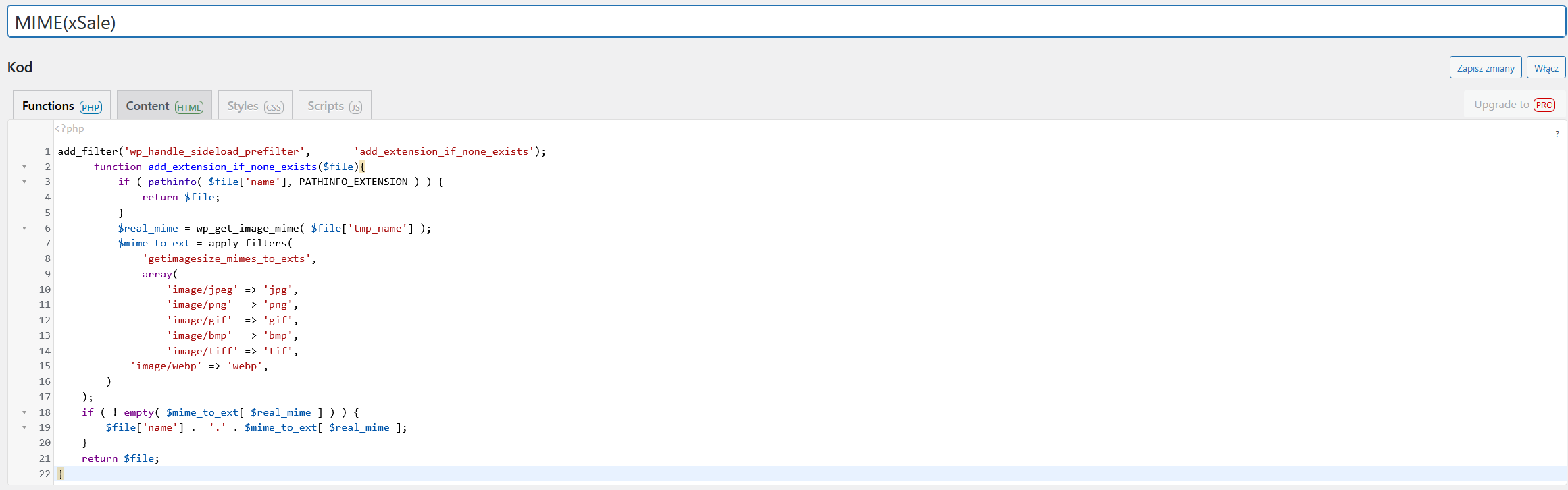 Po instalacji wtyczki, przechodzimy do zakładki Fragmenty kodu i wybieramy „Dodaj nowy”. Wpisujemy nazwę MIME, wklejamy kod, zapisujemy zmiany i klikamy „Włącz”.