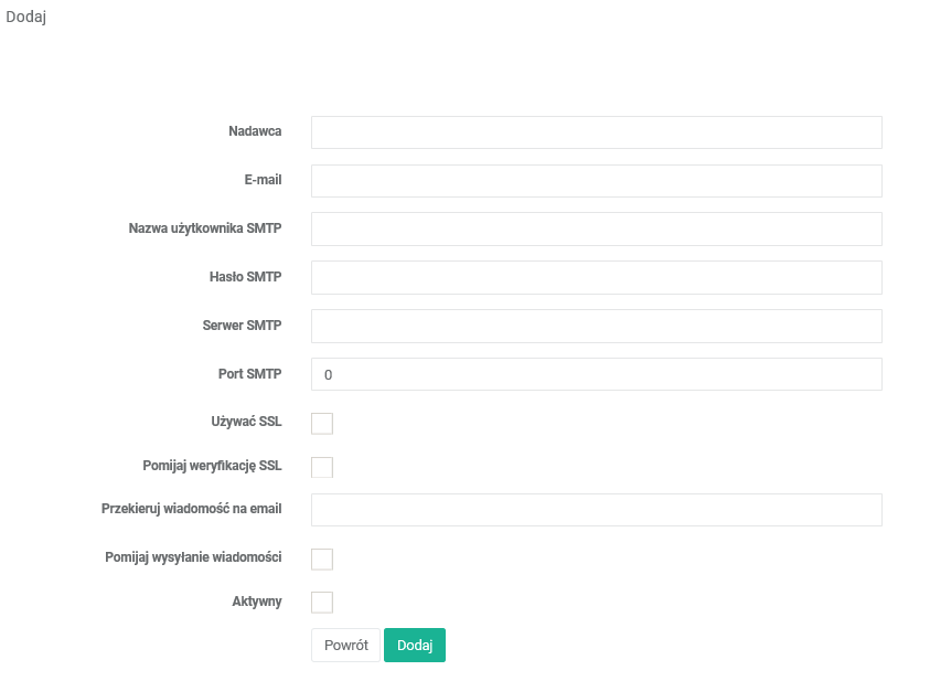 Kliknij przycisk +Dodaj i wprowadź w formularzu dane dostępowe i pozostałe ustawienia konta.