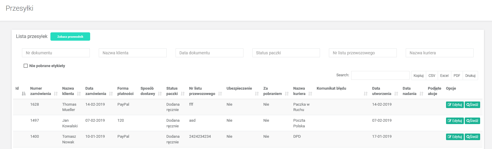 Na liście widoczne są podstawowe informacje o przesyłce: nazwa klienta, status paczki, numer listu przewozowego, sposób dostawy oraz nazwa kuriera. Dzięki dostępności sortowania i filtrowania możesz łatwo odszukać konkretną paczkę. Dodatkowo przy każdej przesyłce znajdują się przyciski akcji: